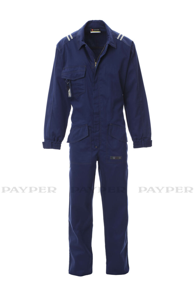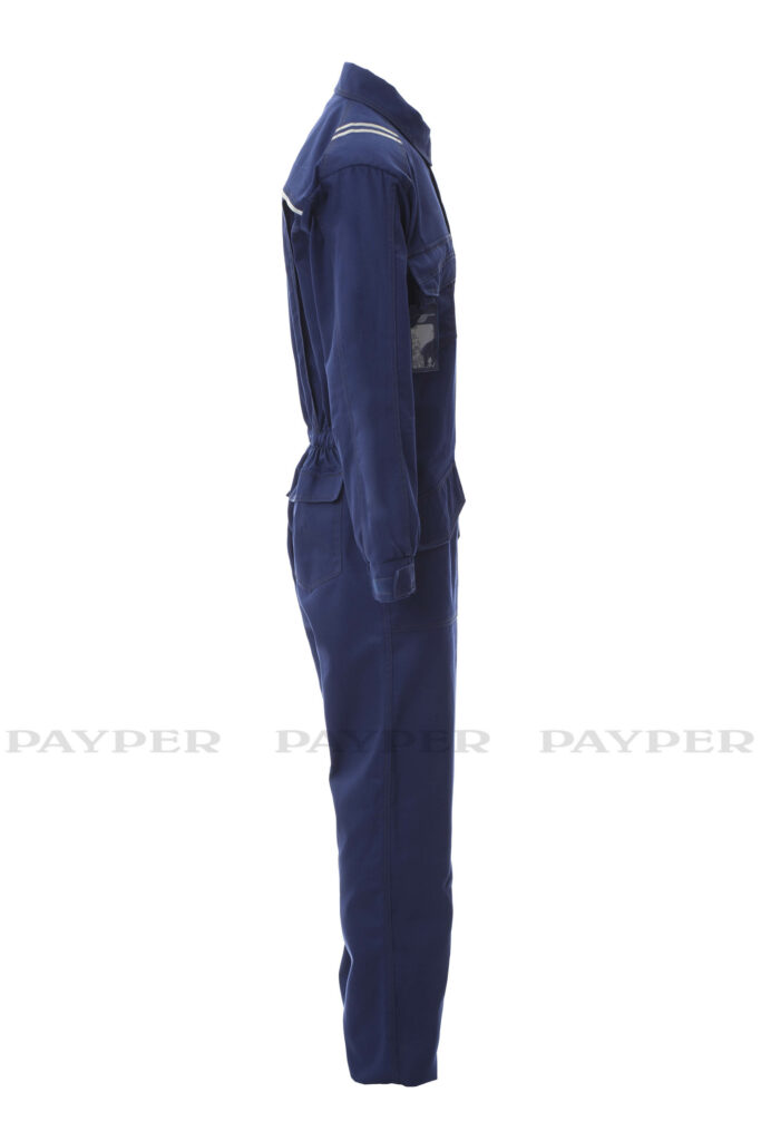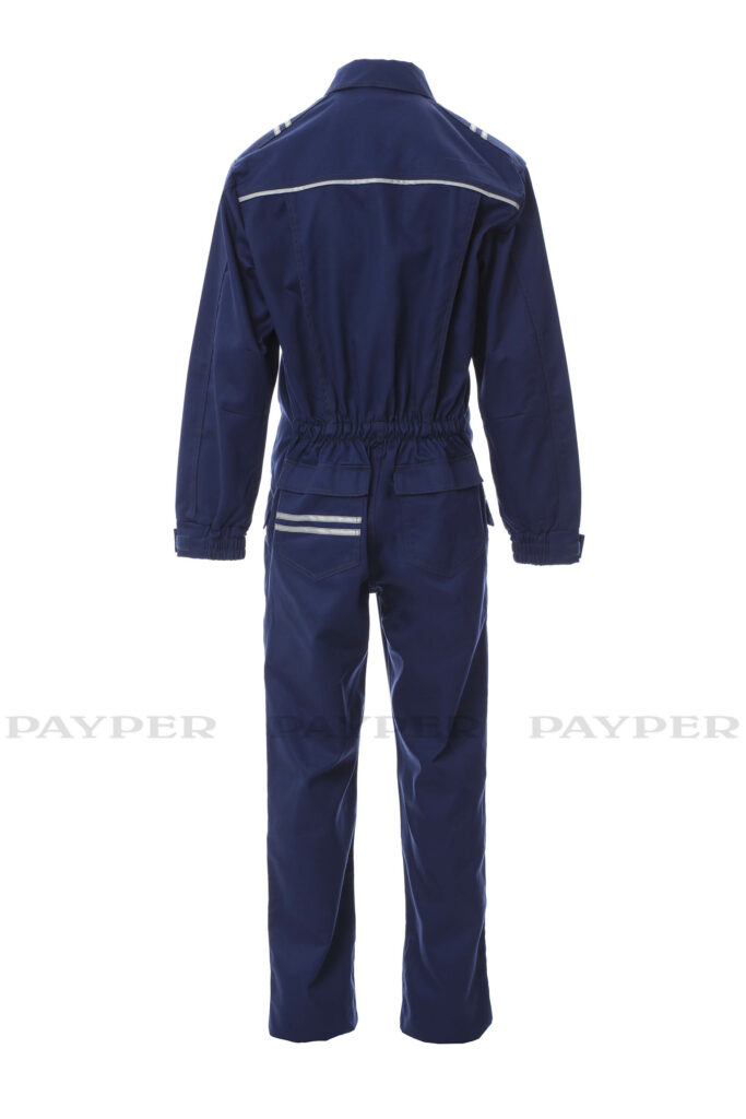 Mono de trabajo de algodón antiestático, antiácido e ignífugo, resistente al arco eléctrico y apto para soldadores. Delantero con cremallera de doble cursor cubierta con tapeta con cierre de gancho y bucle. Mangas pegadas con puños elásticos y trabilla con cierre de gancho y bucle para un mejor ajuste. Espalda con elástico en la cintura y fuelles para una mayor facilidad de movimiento. Costuras dobles en contraste y reforzadas en mangas, laterales y espalda. Dos bolsillos a la altura de la cintura, un bolsillo pequeño en el lado derecho del pecho con soporte para bolígrafos y dos bolsillos traseros cubiertos con tapeta con cierre de gancho y bucle. Bandas retrorreflectantes aplicadas en los hombros, pieza de encaje en la espalda y bolsillo trasero. Soporte de plástico extraíble para tarjeta de identificación.