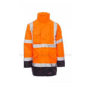 Parka bicolor 4 en 1 de alta visibilidad. Chaqueta exterior sin forro, apertura con cremallera de plástico cubierta con tapeta con cierre velcro, capucha plegable en el cuello, mangas pegadas. Dos bolsillos frontales con tapeta y velcro: a la altura del pecho derecho con velcro, soporte para teléfono móvil y anilla para tarjeta de identificación en su interior, un bolsillo interno con velcro. Dos bandas alrededor del tórax, los hombros y las mangas. Costuras termoselladas. Chaqueta interior desmontable y acolchada con mangas extraíbles, apertura con cremallera de plástico, puños elásticos de canalé, dos bolsillos frontales con cremallera, un bolsillo interno con cremallera, una banda alrededor del tórax y dos bandas verticales en los hombros.
